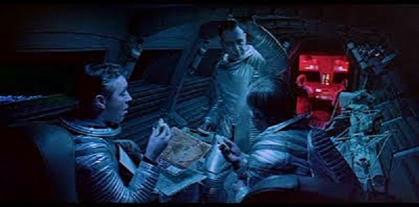 Above left: As mentioned earlier in the analysis, the two men piloting the moonbus are hit men sent by Satan, and the three men in back of the bus are aliens, or more properly, they are aliens occupying men's bodies. One of the three (but not Heywood Floyd) is working 'undercover' as an informant for Satan. What the audience of 2001 hears being said by the three men, and in particular, by the man sitting to Floyd's right, seems to have a straightforward meaning: An area with an intense magnetic field has been discovered on the moon, it is not simply due to an outcropping of magnetic rock, its source is an object (the monolith) that appears to have been deliberately buried four million years ago, etc. However, there is actually a hidden narrative at work here: What the men are saying to each other takes place within a context that is different from what the audience of A Space Odyssey believes it to be. Before the men start talking about the monolith, Floyd notes that the sandwich he has just been handed "looks pretty good." The man standing (it's actually this man who's the informant) says in reply, "They're getting better at it all the time." When he says this, he's not saying that it's specifically the packagers of the food who are getting better at preparing items for use in space; instead, he's speaking as an alien, and he's saying that humans in general are getting better at doing this. When the men begin to look at the photos of TMA-1 and start discussing the monolith, the man seated to Floyd's right gives Floyd a rundown on the 'discovered' object as if it is something that has just been discovered, but what he's really doing is giving Floyd the pre-planned false scenario that has been created by himself and his co-workers, which will be used to explain the object to the viewers of the film or broadcast being made within 2001 (the same partially-faked film as that mentioned earlier in the analysis, i.e., shots of the excavation at TMA-1 are to be part of the same faked movie as the recorded portions of the Jupiter mission). When Floyd ends the conversation by saying, "You guys have certainly come up with something", the "something" is the false scenario that's been created: The monolith is not really a recent discovery, but is instead the 'container' for something that has been stolen from Earth by the aliens, and that has recently been placed on the moon on its way to Jupiter. Above right: In this view of the six astronauts (the five men who were in the moonbus, plus David Bowman), the men are holding their hands at their sides in such a manner as to suggest that they are about to draw guns, as if there's an element of 'wild West' here. This foretells what is about to happen once the men descend into the excavation.